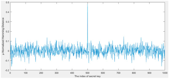 The normalized Hamming distances between hash pairs with the correct secret key and 1000 wrong secret keys.