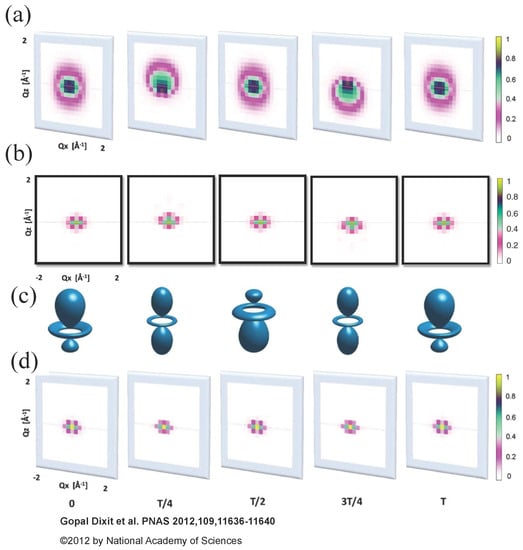 Scattering patterns in the plane () and electronic charge distributions of the wavepacket . (a) Scattering patterns obtained with Equation (18); (b) scattering patterns obtained with Equation (18), but the calculation is restricted to the two electronic states involved in the dynamics; (c) electronic charge distributions and (d) scattering patterns obtained with Equation (13), at pump-probe delay times 0, , , , and T, where the oscillation period of the electronic wavepacket is fs. The intensities of the patterns are shown in units of the DSP from a free electron in all cases. Figure is adopted with permission from Reference [24]. Copyright National Academy of Sciences, 2012.