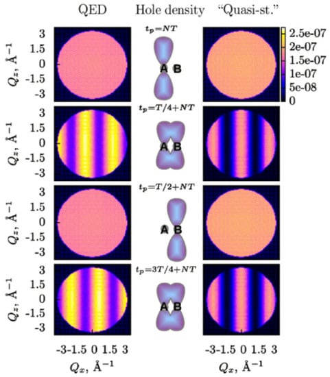 The DSP from the Br molecule has been calculated according to the semiclassical expression in Equation (32) and the correct expression in Equation (30), and compared in Figure 2. In both cases, the signals are constant when the hole is localized on one of the atoms (at times 0 and ), since the scattering channel for the other atom is blocked at these moments, and there is no interference. In contrast to the semiclassical scattering patterns, the scattering patterns according to Equation (30) are different from each other at times and , when the electron hole densities are equal, and depend on whether the hole is moving from site A to site B or vice versa. These scattering patterns are not centrosymmetric with respect to as in the case of NRXS (see Section 4). The QED patterns at times and are not just phase-shifted with respect to the semiclassical patterns, but also have different amplitudes. For example, their intensity is nonzero at any in contrast to the semiclassical patterns, which are zero at . This comparison again demonstrates that the semiclassical approach to describe the interaction of a light pulse with a nonstationary electronic system can lead to erroneous time- and momentum-dependence of a time-resolved signal. Correct results demand a thorough analysis within the QED framework.