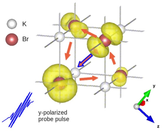 Snapshot of the electron-hole density at time in a fragment of (KBr) cluster visualized using VESTA software [66]. The orange arrows represent the electron-hole currents between the Br atoms. The blue-framed arrow represents a current parallel to the probe-pulse polarization. Figure is reproduced with permission from Reference [28]. Copyright American Physical Society, 2015.