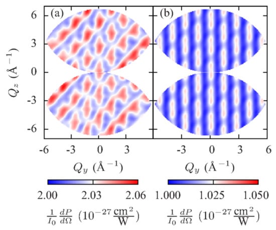 A scattering pattern at a time is shown in Figure 4. Since scattered polarizations are different at each vector, an additional -dependence appears in the DSP and leads to a nonperiodic scattering pattern in Figure 4a. This dependence is eliminated in the scattering pattern in Figure 4b, which is determined solely by the trigonometric functions in Equation (33). Figure 5a shows the imaginary part of the Fourier transform from space to real space of the scattering pattern in Figure 4b extrapolated to a region of infinite and . In accordance with Equation (38), it consists of delta peaks at points corresponding to vectors connecting pairs of Br atoms (see Figure 3). The amplitudes of peaks at points are opposite to the amplitudes of peaks at .