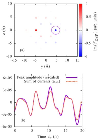 Performing an analysis of the electronic structure of KBr, the authors found a way to resolve interatomic currents between Br atoms in a direction parallel to the probe-pulse polarization. They suggested to measure scattering patterns at different time delays , perform the Fourier transform of these scattering patterns from space to real space and follow the amplitude of the peak outlined in the circle in Figure 5a in the imaginary part of the Fourier transform. The evolution of the amplitude of this peak depending on the time of measurement is shown in Figure 5b with the solid violet line. It precisely reproduces the time evolution of the computed sum of the currents between all pairs of nearest-neighbor Br atoms connected by the vector shown in the orange dashed line in Figure 5b, where is the distance between the nearest-neighbor Br atoms. Thus, it has been shown in Reference [28] that if a proper polarization of the incoming probe pulse has been chosen for measurement of scattering patterns, the time evolution of the amplitude of a certain delta peak in their Fourier transform follows the time evolution of the sum of the interatomic currents between atoms connected by the vector corresponding to this peak. The required polarization of the probe pulse can be determined by an analysis of the electron structure of the crystal.