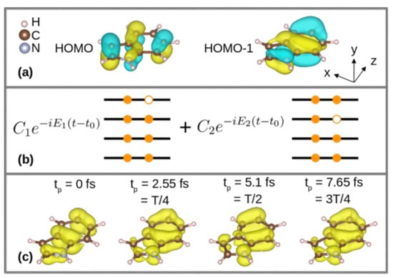 - Mignolet, B.; Levine, R.D.; Remacle, F. Localized electron dynamics in attosecond-pulse-excited molecular systems: Probing the time-dependent electron density by sudden photoionization. Phys. Rev. A 2012, 86, 053429. [Google Scholar] [CrossRef]