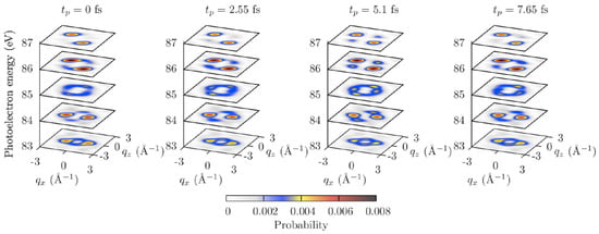 Alternatively to using photons for imaging electron dynamics with X-ray scattering, one can consider employing photoelectrons dislodged by ultrashort light pulses for this goal. Time- and angle-resolved photoelectron spectroscopy (TRARPES), i.e., time- and energy-resolved molecular-frame photoelectron angular distributions, using ultrashort extreme ultraviolet (XUV) probe pulses inducing single-photon ionization has been proposed for imaging coherent electron dynamics in molecules [29,30,31,32]. High-energy photoelectrons generated by XUV pulses, on the one hand, provide Ångstrom spatial resolution and, on the other hand, allow for a less sophisticated interpretation than that in the case of low-energy photoelectrons, where multiple scattering effects can be substatial [33].