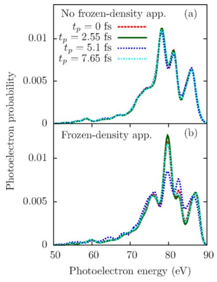 where is the position of the object, is the time of the measurement, is the pulse duration (FWHM of the pulse intensity) and is the peak intensity. It was further assumed that the probe-pulse duration is much shorter than the characteristic time scale of changes in the electron density. Hereafter, we will refer to this assumption as the frozen-density approximation. As we discuss in Section 7, this is a necessary condition for an appropriate time-resolved measurement. The resulting time-dependent DSP can be represented as