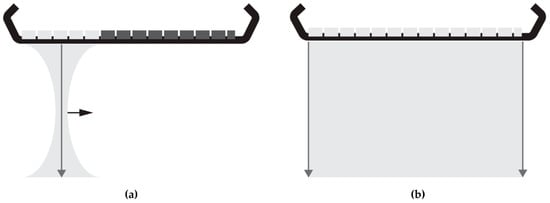 Illustrations of: (a) a focused acquisition series in which the aperture (active elements in light gray) is shifted to acquire data line-by-line by transmitting a focused ultrasound beam and receiving the reflected signal for each aperture position; (b) a plane-wave acquisition, where an unfocused ultrasound is transmitted and reflected signals are received by the full transducer aperture.