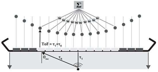 DaS is a beam-forming method based on delaying the element signal by the expected time-of-flight (ToF) and summation of the element data points (Figure 2). For a certain point to be reconstructed, the ToF is calculated as the time of the plane-wave propagating to that point and the reflected or back-scattered signal to be received by the elements. The ToF is used to identify and sum the signals originating from each point in the element data. In dynamic focusing in receive, the F-number (F) dictates the number of elements (aperture) used for beam-forming: