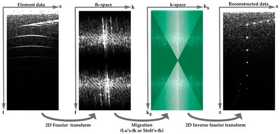 Another approach is beam-forming in the Fourier domain by Lu’s-fk or Stolt’s-fk which are computationally less expensive and can run around 25 times faster compared to DaS []. In both methods, 2-D element data in the spatial-temporal domain are transformed to the fk-space. Next, a migration method is applied to transform the data into the complete k-space and finally the migrated data are transformed back into the spatial-temporal domain (Figure 3). A migration method of plane-wave ultrasound was first carried out by Lu et al. from the analysis of limited diffraction beams [,]. Lu et al. introduced the mapping rule throughout the transmission–scattering–receiving process. More recently, Garcia et al. proposed another method by adapting Stolt’s-fk seismic wave migration to the plane wave ultrasound scenario []. In this modification, the plane wave’s backscattering is fitted with waves spontaneously radiating from sources. Comparing Stolt’s-fk and Lu’s-fk, the two methods share a similar spectrum content at small angles, while their spectra differ more significantly in the mapping of large angles.