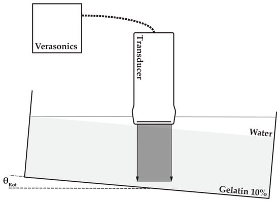 The phantom, including the container, was positioned on top of a seesaw to enable rotation of the phantom. One of the four different linear array transducers utilized in this study (Table 1) was positioned above the phantom top surface such that the transducer footprint was unable to touch the phantom after rotation at the maximum angle of 10 degrees. Water was poured on the top surface of the phantom to fill the remaining 20 mm space and to ensure acoustic coupling between the transducer and phantom. The transducer was connected to a Verasonics V1 system (MS250 to Verasonics Vantage) to enable 0° plane-wave transmissions and element data collection using the center 128 elements of the transducer (MS250: all 256 elements). Element data were recorded prior to and after rotation (~2°) of the phantom. The experimental setup is also visualized in Figure 4.
