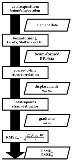 Consequently, sxx and szz in (Equations (4) and (5)) approximate zero, independently of the rotation angle and center. As these gradients (strains) yield 0 and the exact rotational angle and center were unknown in this experiment, we adopted the root-mean squared error (RMSE) of the gradients as a measure of the accuracy of the displacement estimates. The gradients of the displacements were calculated using a one-dimensional three-point least-squares strain estimator []. Gradients were only calculated and evaluated within a field-of-view (FoV) measuring –10 to 10 mm laterally and 17.5 to 52.5 mm axially for all transducers. However, the FoV measurement of the MS250 transducer was –8 to 8 mm laterally, since the FoV was limited by the transducer footprint. The top 17.5-mm axial depth was measured through water and was therefore neglected for all transducers. All acquisition and processing steps and intermediate results are summarized in Figure 5.