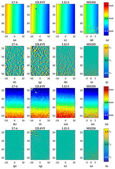 Figure 6 provides an overview of the estimated axial and lateral displacement and strain fields for all probes using Lu’s-fk beam-forming and a line density of two lines per pitch. As expected from Equations (2) to (6), the axial displacement fields (Figure 6a–d) were constant in the axial direction and so the gradient of the axial displacements in axial directions (szz) were approximately 0% (see Figure 6f–i). For the 12L4VF transducer the results revealed some artifacts in the left top corner (Figure 6b,g). These artifacts were visible for all beam-forming strategies and line densities. The MS250 transducer showed more outliers at lower depths (30–52.5 mm) which were probably caused by attenuation of the ultrasound signal at relatively large depths for this frequency.