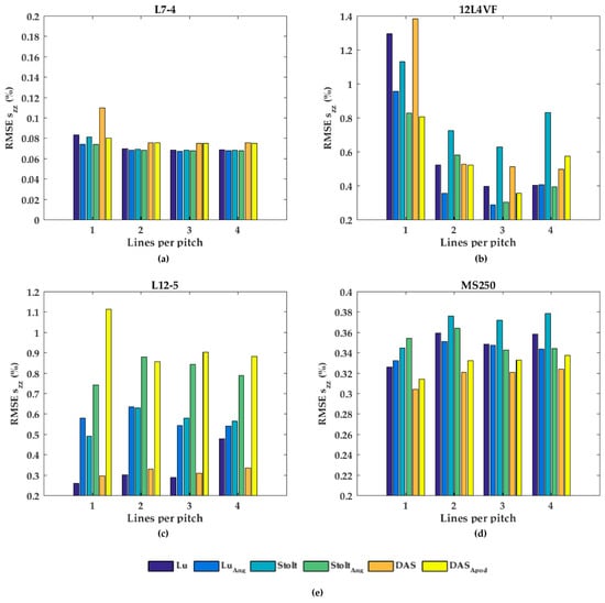 The root-mean-squared error (RMSE) of the lateral strains (sxx) for all beam-forming strategies and line densities for the (a) L7-4, (b) 12L4VF, (c) L12-5, and (d) MS250 transducer; (e) is the legend used in (a–d).