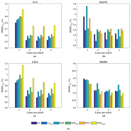 In Figure 7, the performances of the axial displacement estimates are summarized for all transducers, beam-forming strategies (including angular weighting and apodization) and line densities. As can be noticed for L7-4 (Figure 7a), the RMSE seemed to be almost constant for all beam-forming strategies and line-densities except DaS with one line per pitch, in which the RMSE increased. For the 12L4VF (Figure 7b), three lines per pitch provided the lowest RMSE using Lu’s-fk, Stolt’s-fk or DaS, with apodization or angular weighting. Furthermore, apodization or angular weighting seemed to decrease the RMSE for this transducer. However, the opposite effect of weighting and apodization can be seen for both the L12-5 and MS250 (Figure 7c,d) in which the RMSE increased. Multiple lines seemed to slightly increase the RMSE compared to one line per pitch for all strategies in these transducers. DaS or Lu’s-fk with one line per pitch resulted in the lowest RMSE in both L12-5 and MS250. The RMSE by the lateral displacements estimates (Figure 8) decreased for each method and transducer using over 1 line per pitch.