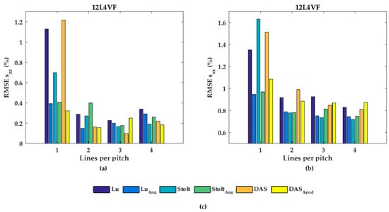 The RMSE increased when applying angular weighting or apodization for all transducers except 12L4VF, for which the RMSE decreased. Lu’s-fk resulted in slightly decreased RMSE compared to other methods in both L7-4 and L12-5; Lu’s-fk with angular weighting in 12L4VF, and Lu’s-fk and DaS in MS250. For the 12L4VF, the RMSEs were recalculated neglecting the left top area (squared area; axial < 28 mm; lateral < 0 mm, Figure 6g,q) including the artifact. The results are presented in Figure 9. Although the overall RMSE values decreased, the observed results were similar to those for the full FoV (Figure 7b and Figure 8b). Line densities of two or three lines per pitch resulted in the lowest RMSE for all strategies. Apodization or weighting seemed to decrease RMSE values but less severely and at times even increased values. This artifact might be caused by a small number of damaged elements on the left side of the transducer, resulting in artifacts especially in the near-field as only a few elements were used for reconstruction in that area.