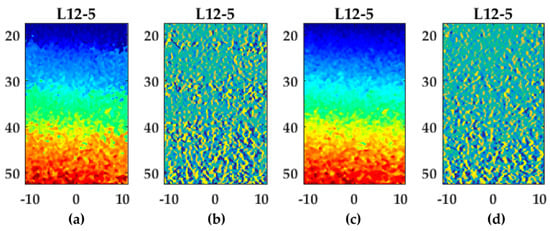 Lateral displacement and strain fields using Lu’s-fk for the L12-5 transducer: (a,c) displacement field using one (a) or two (c) lines per pitch. Please refer to Figure 6o for the color bar; (b,d) strain field using one (b) or two (d) lines per pitch. Please refer to Figure 6j and Figure 6t for the corresponding color bars.