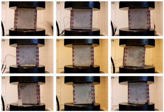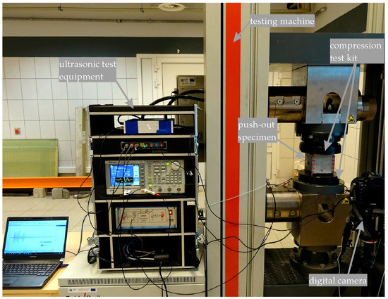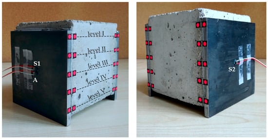 Experimental procedure included simultaneous push-out and wave propagation testing. Push-out tests were performed in the testing machine Zwick Z400 equipped with a compression test kit. The force and the displacement of the cross-head were recorded. The preload applied to the specimen was equal to 100 N. Then, each steel-concrete specimen was loaded with the speed of the crosshead of 0.1 mm/min up to the failure. Additionally, photographs were taken every 2 s on the front side of the specimen by the Canon EOS 5D III digital camera to observe the damage evolution and to determine the slip between steel and concrete. At each specimen, 10 pairs of magenta points with a diameter of 4 mm were attached at five levels (levels I to V, as indicated in Figure 2).