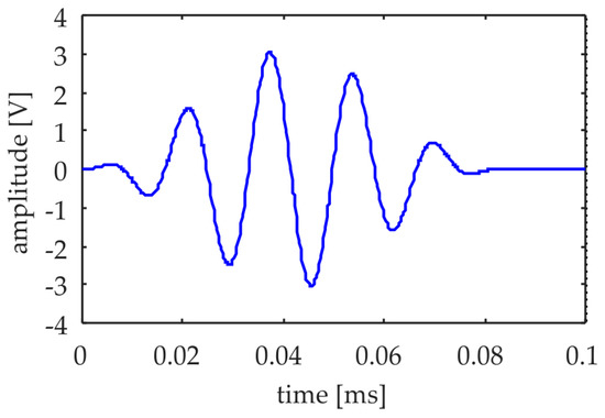 During the mechanical degradation in the testing machine, ultrasonic waves were induced and acquired every 2 s, until the specimen failure. Figure 3 shows the experimental setup. Three multilayer piezoelectric actuators NAC2024 manufactured by Noliac were used for both excitation and registration of wave propagation signals. They were adhesively bonded to the steel plates using petro wax (PCB 080A109). The configuration of piezoelectric transducers is given in Figure 2. The actuator (A) was bonded at the center of the left steel plate. The first sensor (S1) was attached next to the actuator, while the second one (S2) was attached at the center of the right steel plate. An arbitrary waveform generator (Tektronix AFG3022C) created an excitation signal in the form of a wave packet composed of a 5-cycle sine with a central frequency of 60 kHz modulated by the Hanning window (Figure 4). Then the signal was amplified 20 times by a high voltage amplifier (FLC Electronics AB A400DI). A digital oscilloscope (PicoScope 4824) was used to collect time signals of propagating waves with a sampling frequency of 20 MHz.