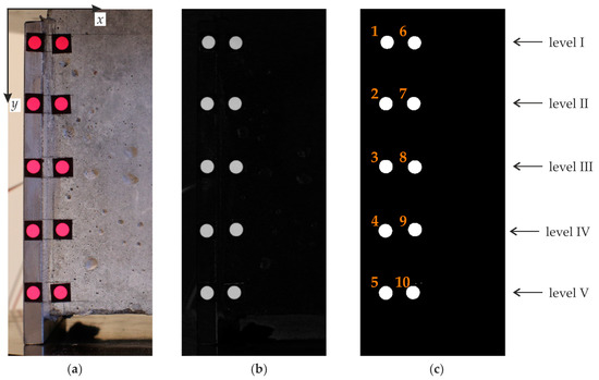 where colors are marked as follows: c—cyan, m—magenta, y—yellow, k—black, r—red, g—green, b—blue. From the CMYK space, a component connected with magenta color was chosen for further processing (Figure 5b) in which the photograph was converted into a binary image with a threshold of 0.25 (Figure 5c). Then, for given points, the centers of gravity were calculated and the interface slips in x and y directions were determined at five levels (levels I to V).
