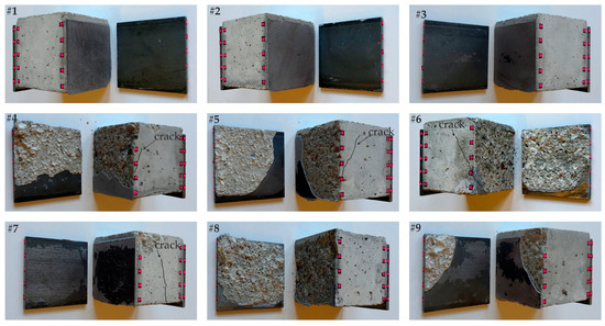 Figure 6 and Figure 7 illustrate all push-out specimens after failure. The specimens were divided into two sets according to observed failure modes. Mode I (specimens #1–#3) was an adhesive-type failure occurring at the interface between the steel plate and the adhesive layer. No damage was observed in the concrete cube. The entire adhesive layer remained on the concrete. Mode II (specimens #4–#10) included a cohesive-type failure or mixed cohesive-adhesive failure. In mode II, three sub-groups were distinguished: mode IIa (specimens #4–#6), mode IIb (specimen #7) and mode IIc (specimens #9–#10). The damage in modes IIa and IIb included two phases. In the first phase, the damage was mainly cohesive with a failure in the bulk of the concrete cube. The second phase was a separation of the steel plate from the concrete. In mode IIa, a single diagonal crack originated from the interface between steel and concrete, and then the cohesive (specimen #6) or mixed cohesive-adhesive failure (specimens #4, #5) occurred in the bulk of the adhesive layer. In mode IIb, a crack appeared in the middle of the concrete cube and then the adhesive failure occurred. The failure in mode IIc was cohesive (specimen #8) and mixed adhesive-cohesive (specimen #9) with a separation in the bulk of the adhesive layer.