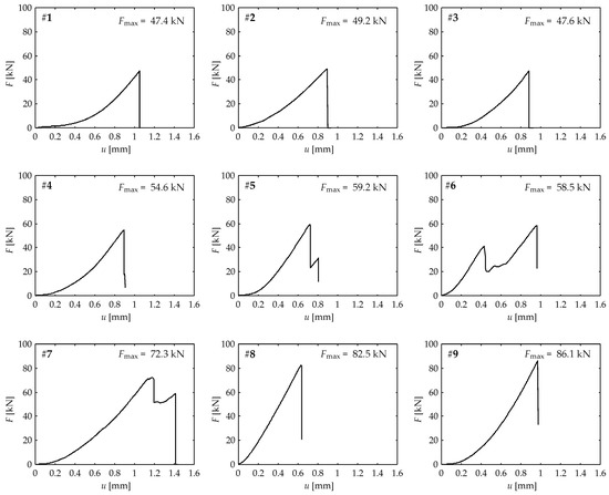 Experimental force-displacement (F-u) curves of tested push-out specimens (#1–#9).
