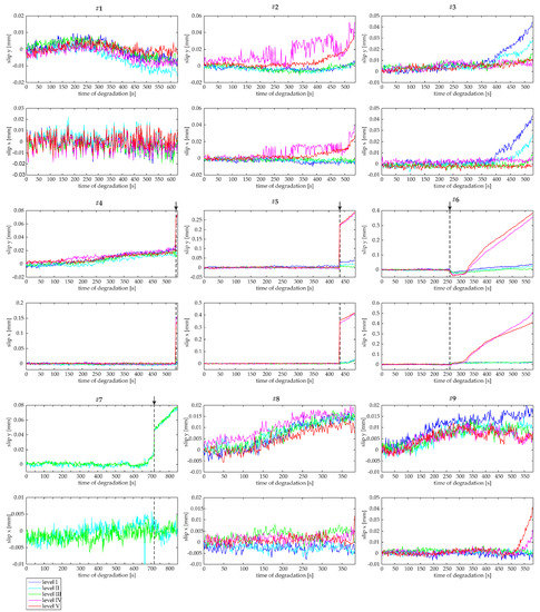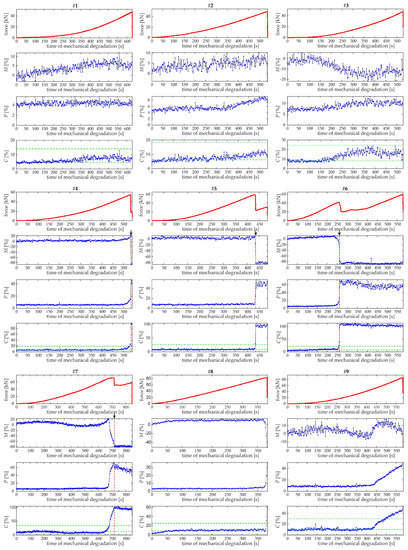 Considering the specimens with the adhesive-type damage (the first row in Figure 11), all error measures are rather constant during the entire push-out test. A slight increase in the P-error value was observed for specimen #6; however, based on these errors it was not possible to detect incoming damage before the failure.