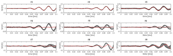 The ultrasonic waves were registered automatically every 2 seconds during push-out testing. All signals acquired by sensor S2 for specimens #1 to #9 are illustrated in Figure 10. Only an initial part of the signal with a length of 0.1 ms was analyzed to reduce the influence of interactions of waves with the compression test kit of the testing machine. The reference signal, i.e., the signal registered at the beginning of the push-out test is marked in black and the last acquired signal is marked in red. For specimens #1–#3, representing the adhesive-type failure (mode I), signals relating to successive states of mechanical degradation are similar and no significant changes in the magnitude or phase can be observed. In the case of push-out specimens #4–#10, for which the cohesive or mixed adhesive-cohesive failure occurred (mode II), experimental waveforms changed considerably during mechanical degradation.