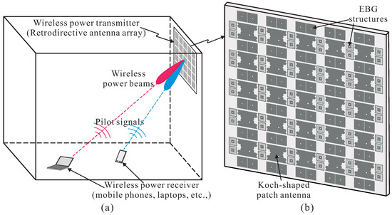 Figure 1a demonstrates a wireless power transmission scenario of the type used in a typical indoor environment, such as an office or a living room. Inside the room, there are electronic devices, such as laptops and mobile devices, which serve as power receivers. They are located randomly at the different positions of the users and are assumed to be able to move freely. These electronic devices can be charged wirelessly from the transmitter by broadcasting pilot signals. In response to the pilot signals, the transmitter transmits power wirelessly back in the reverse direction to the electronic devices. The wireless power transmitter is a RDA which can be mounted on the ceiling or walls. In this work, the RDA is a CP microstrip patch antenna array incorporated with EBG structures, as illustrated in Figure 1b. The microstrip patch antenna is designed using the Koch fractal shape for circular polarization operation and to reduce the size. The mushroom-like EBGs are used to suppress the mutual coupling effects between antenna elements, therefore enhancing the performance of the proposed CP RDA.
