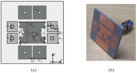 Figure 2a illustrates the configuration of a single CP Koch-shaped patch antenna surrounded with EBGs. The Koch fractal shape is applied into two edges along the x-direction of a rectangular patch. This Koch-shaped patch is excited through a feeding point located at distances of and from the center of the patch towards the - and -axes, respectively, to realize good circular polarization. The antenna is designed and optimized to operate at a frequency of 5.2 GHz using a previously published design process [17,18,19,20]. Both the patch and the EBGs are printed on the upper layer of a single Taconic dielectric substrate with a dielectric constant of 3.5, a thickness of 1.52 mm, and a loss tangent of 0.0019. Owing to the difference in the geometry of the Koch-shaped patch along x- and y-axes, two types of EBGs are used. A conventional mushroom-like EBG structure is located along the y-axis [21]. Meanwhile, a slot-loaded mushroom-like EBG structure, which has compact size to avoid overlapping of the patch, is placed along the x-axis [22]. By etching two rectangular slots on the metallic patch of the EBG cell, the series equivalent capacitance can be enlarged, resulting in a more compact EBG structure. Both of these EBGs are designed to suppress the mutual coupling at a frequency of 5.2 GHz. The proposed design is simulated and optimized using CST Microwave Studio software with conductor and dielectric losses taken into consideration.