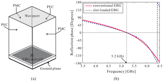The EBGs were optimized by placing one cell in the computation domain. Two perfect electric conductor (PEC) walls and two perfect magnetic conductor (PMC) walls were used to simulate the infinite-sized periodical structure [23], as shown in Figure 3a. We calculated the reflection phases of the EBGs. Simulated reflection phases are presented in Figure 3b for both the optimized conventional and slot-loaded mushroom-like EBGs with the optimized parameters listed in the caption of Figure 2. As observed in Figure 3b, the resonance frequencies for the 0° reflection phases are approximately 5.2 GHz.