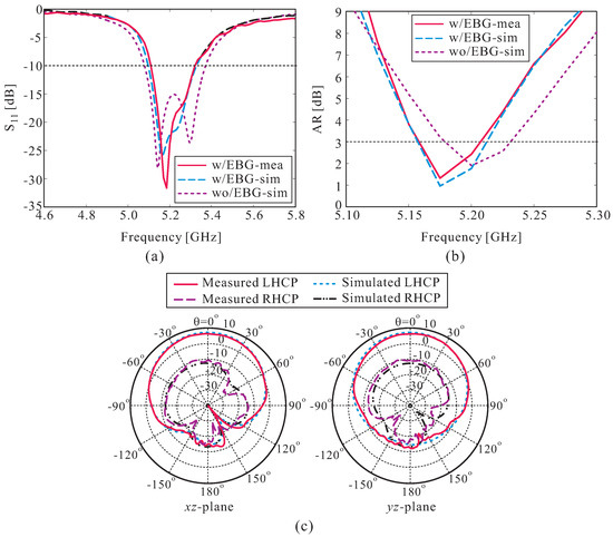 A prototype of the antenna with the EBGs is fabricated using the optimized parameters, as shown in the caption; a corresponding photograph is shown in Figure 2b. The measured and simulated results of the single CP Koch-shaped patch antenna with the EBGs are depicted in Figure 4. Note that the measured results are in good agreement with the simulated results. A −10 dB reflection bandwidth of 5.12–5.30 GHz was found during the measurement. The measured axial ratio (AR) value was 2.42 at the designed frequency of 5.2 GHz; meanwhile, a minimum AR value of 1.32 dB was obtained at 5.175 GHz. The measured 3 dB AR bandwidth was 5.16–5.21 GHz. An antenna without EBGs was also investigated, and these simulated results are included in Figure 4a,b. It can be seen that the 3 dB AR bandwidth of the proposed antenna with the EBGs was shifted slightly to a lower frequency range. Moreover, the minimum simulated AR value was reduced from 1.90 to 0.96 dB when using the EBGs, hence improving the CP purity. The radiation patterns at the designed frequency of 5.2 GHz on the two major cutting planes (the - and -planes) are shown in Figure 4c. It was found that the radiation patterns exhibit left-handed circular polarization (LHCP), in which the LHCP gain is approximately 17.1 dB higher than the right-handed circular polarization (RHCP) gain in the -direction.