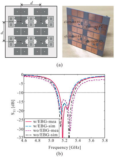 (a) The 2 × 2 array configuration for consideration of the mutual coupling and a photograph of the fabricated prototype; (b) Measured and simulated reflection coefficients of the 2 × 2 array with and without the EBGs.