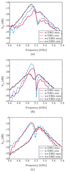 To examine the performance of the EBGs for the mutual coupling reduction, a 2 × 2 array configuration is studied. A prototype was fabricated and a photograph was taken, as shown in Figure 5a. The antenna elements are spaced at a distance of d = 0.4 along the x- and y-axes ( is the wavelength in free space at 5.2 GHz). Figure 5b plots the measured and simulated reflection coefficients of the 2 × 2 arrays with and without the EBGs when element #1 is excited. It can be observed that the −10 dB reflection bandwidths are centered at 5.2 GHz. The mutual coupling effects on three typical cutting planes, i.e., the horizontal, diagonal, and vertical planes, are investigated, as represented by the terms , and , respectively. The results of a comparison of the measured and simulated results of , and are illustrated in Figure 6. Within the operating frequency band, maximum mutual coupling reductions of 9.47 dB, 12.78 dB and 1.38 dB were obtained by measurements on the horizontal, diagonal, and vertical planes, as shown in Figure 6a–c, respectively. Meanwhile, in the simulated results, the corresponding values were 10.78 dB, 17.1 dB and 6.62 dB. Note that due to the limited spacing between two patches, only one row of EBG cells was implemented. Therefore, the bandwidth for mutual coupling reduction was very narrow, but the designed frequency of 5.2 GHz was within this bandwidth. Reasonable agreement was also achieved between the measurement and the simulation. The discrepancy between the measurement and simulation results was mainly attributed to experimental tolerances and fabrication imperfections, especially the losses at the soldered joints between the coaxial cables and the patches.