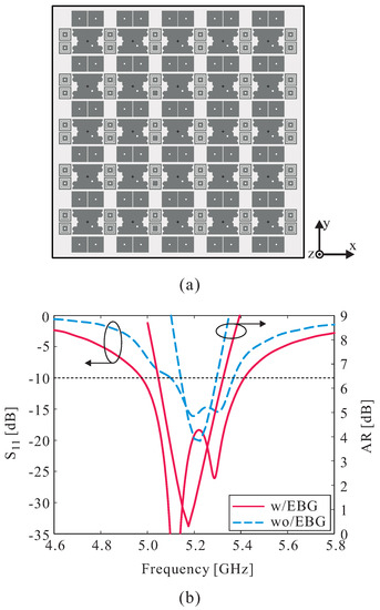 (a) 5 × 5 CP Koch-shaped patch array with the EBGs; (b) Simulated results of the reflection coefficients and ARs.