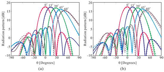 In this section, the 5 × 5 array of Koch-shaped patch antenna with the EBGs is studied. The inter-element spacing is reduced to as small as 0.4 to realize a compact size. Figure 7a shows the configuration of the 5 × 5 Koch-shaped patch antenna array with the EBGs. For the simulation, a port was used for each antenna element, and all ports were simultaneously excited. Performance outcomes with regard to the active reflection coefficient and the AR of the center element were investigated and presented. A comparison of the reflection coefficients and ARs for the center element of the array with and without the EBGs was conducted, with the results illustrated in Figure 7b. Note that the AR values are observed in the -direction. It is evident that the CP performance of the array without the EBGs was considerably deteriorated due to the strong mutual coupling effects. The minimum AR value was increased to 3.83 dB. In contrast, with the EBGs, the CP performance was significantly improved. Owing to the reduced mutual coupling, the minimum AR value was reduced to 0.31 dB. At the designed frequency of 5.2 GHz, an AR value of 1.20 dB was achieved. In addition, the −10 dB reflection bandwidth was enhanced with the presence of the EBGs. The radiation patterns, when all ports were simultaneously excited, at 5.2 GHz are depicted in Figure 8 for the two major cutting planes of the - and -planes. With the EBGs to reduce mutual coupling, an approximate gain enhancement of 0.4–0.8 dB was obtained as compared to the array without the EBGs when the radiation pattern is scanned from the broadside to 60° on each plane. Therefore, the simulated results demonstrated that the presence of the EBGs significantly enhances the CP performance of the RDA despite the fact that the inter-element spacing is reduced to as small as 0.4.