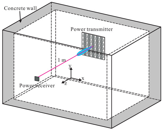 The wireless power transmission performance capabilities of the proposed RDA with the EBGs are investigated. The simulation model, as shown in Figure 9, was performed using CST Microwave Studio. The receiver antenna is a single CP Koch-shaped patch antenna operating at 5.2 GHz and is located along the -direction. Here, 5 × 5 Koch-shaped patch arrays with and without EBGs are used as wireless power transmitters, transmitting a total power of 50 W. The power transmitter and receiver are enclosed by a concrete box filled with air to approximate a practical indoor environment. The concrete box has overall dimensions of 2 × 1.2 × 1.2 m3. Approximately 400 million mesh cells are used for each simulation of the wireless power transmission. All simulations are run on a computer with an Intel Core i7-5960X 3.0 GHz CPU and 128 GB of RAM integrated with two NVIDIA Quadro P6000 GPUs. The average runtime is approximately four hours for each simulation. The wireless power transmission procedure involves two steps. In the first step, only the receiver antenna was excited, and the transmission coefficient phase from the receiver antenna to each of the antenna elements of the power transmitter were recorded. The phase profile was then analyzed through phase conjugation at each antenna element. In the second step, all of the antenna elements of the power transmitter were simultaneously excited with the conjugate-phase profile, forming a wireless power beam back in the reverse direction to the power receiver. The wireless power transmission performance is evaluated by analyzing the amount of received power at the receiver. To realize a far-field retrodirective scenario, the distance between the power transmitter and the power receiver is set to 1 m. Received power of 0.2685 W was harvested by the receiver when the power was transmitted by the RDA with the EBGs. Meanwhile, when the power was transmitted by the RDA without the EBGs, only 0.2412 W of power was received. Therefore, an improvement of 11.32% is achieved using the RDA with the EBGs.