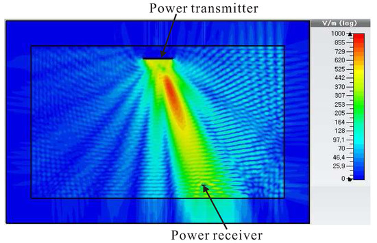 Finally, the wireless power transmission performance capabilities when the power receiver moves along the x- and y-directions were investigated. Here, 10 × 10 CP RDA arrays with and without EBGs and with an inter-element spacing of 0.4 are used as transmitters to transmit a total power of 50 W. The simulated electric field distribution at 5.2 GHz, when the power receiver is located off the broadside direction, is illustrated in Figure 10. It can be observed that the electromagnetic wave propagates in a direction toward the location of the power receiver. Table 2 summarizes the simulated results of the received power outputs, as harvested by the power receiver as a result of the power transmitted by the 10 × 10 CP RDA arrays with and without the EBGs. Clearly, the amount of received power was reduced as the power receiver was moved away from the broadside direction. However, as demonstrated in Table 2, the use of the EBGs resulted in a significant improvement in the received power due to the reduced mutual coupling. An improvement which ranged from 12.91 to 21.02% was obtained as compared to the case without EBGs when the power receiver moves along the x- and y-directions. This again validates the performance enhancement of the proposed CP RDA with EBGs during wireless power transmission.