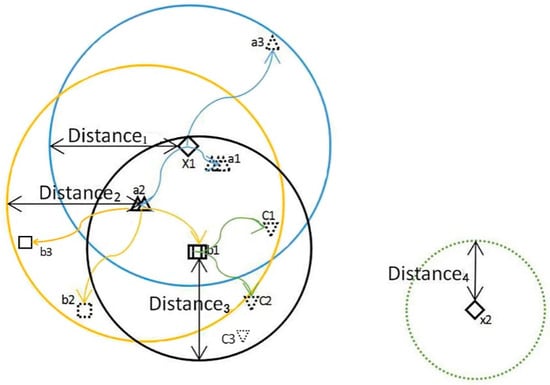 (a2) and □(b1), respectively. According to Rule2, Distance2 evolves based on Distance1, and Distance3 is learning from Distance2 and Distance1. If b1 spreads seeds, the distance of b1’s offspring is based on Distance2 and Distance3. - Plants are constantly spreading seeds around and causing flora to migrate so that flora can find the best area to live.
