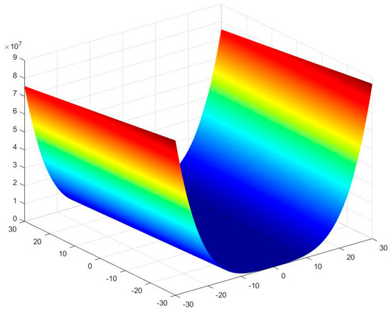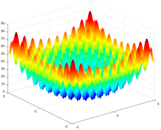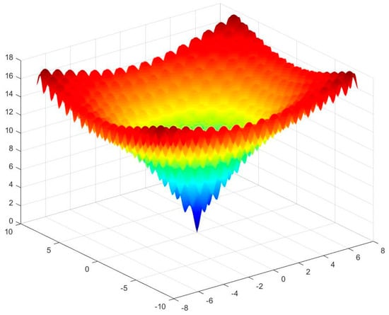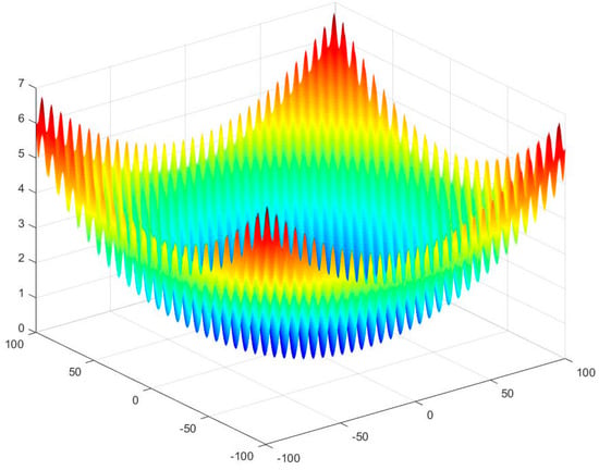 In this section, we use six benchmark functions [48,49] to test the efficiency and stability of artificial flora algorithm. The definition, bounds, and the optimum values of functions are shown in Table 3. For a two-dimensional condition, the value distributions of these functions are shown in Figure 3, Figure 4, Figure 5, Figure 6, Figure 7 and Figure 8. It can be seen from the Figure 3 and Figure 4 that Sphere (f1) and Rosenbrock (f2) functions are unimodal functions that can be used to test the optimization precision and performance of the algorithm. f3 to f6 functions are complex nonlinear multimodal functions. The general algorithm has difficulty finding the global optimal value. Because they have many local extreme points, they can be used to test the global search performance and the ability to avoid prematurity of algorithm.