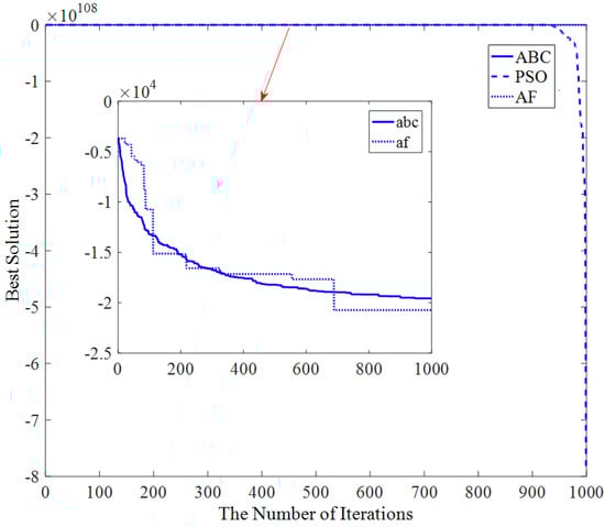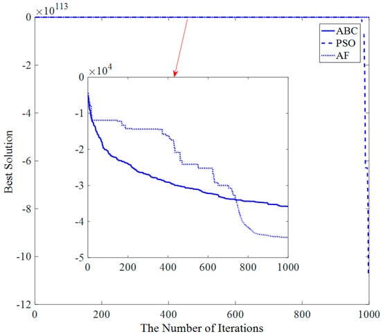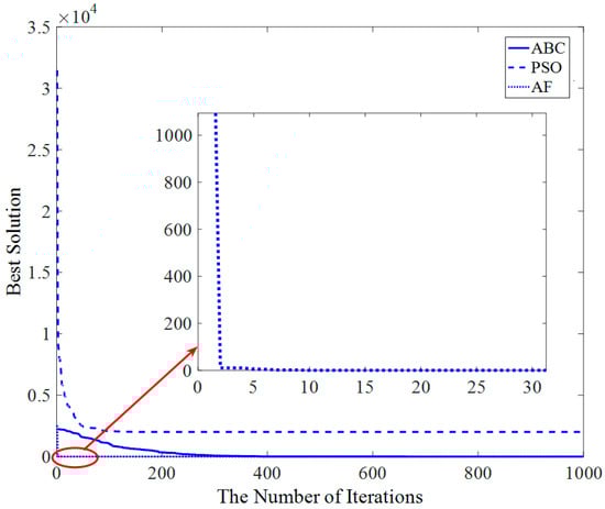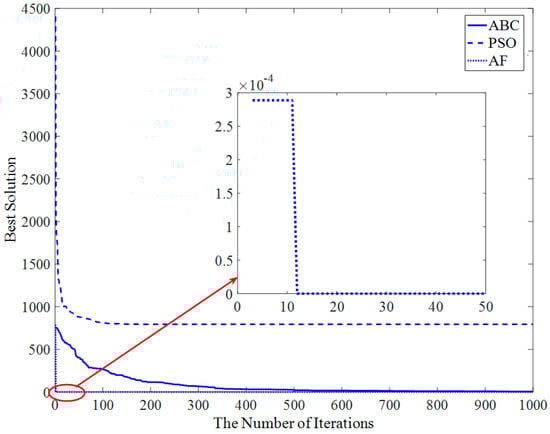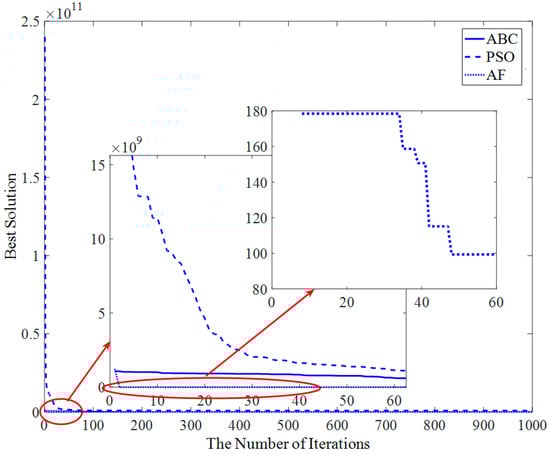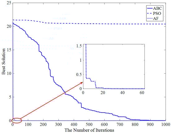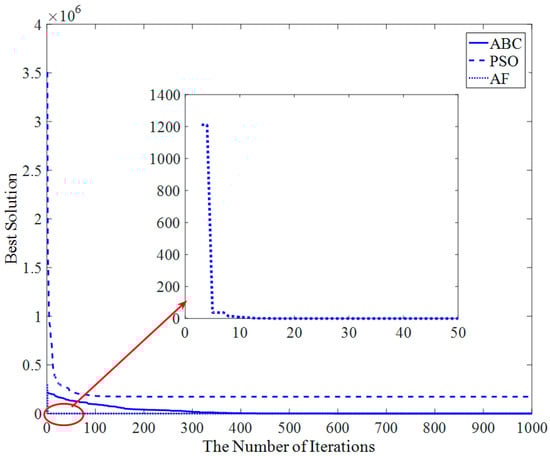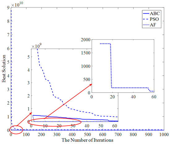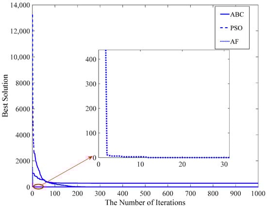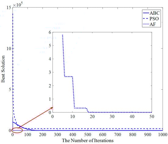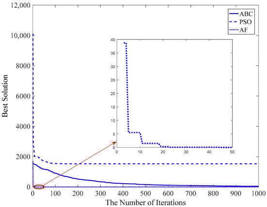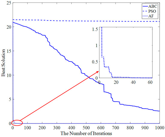 Figure 13 shows that the AF algorithm converges at about the 23rd iteration, and the PSO and ABC algorithms converge at about the 50th iteration and 200th iteration, respectively.