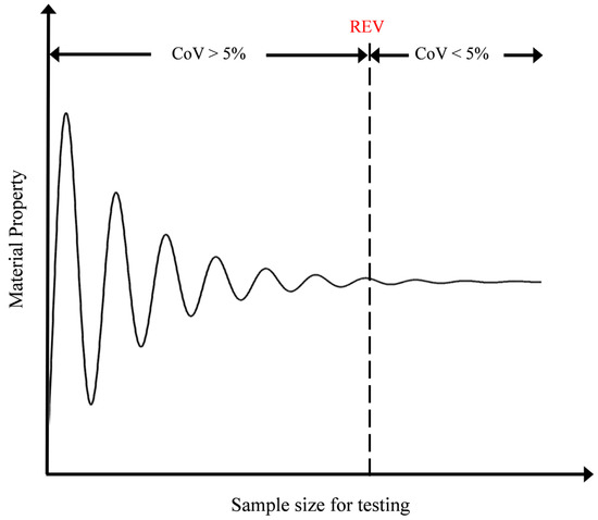 Figure 4. Scatter in material properties with respect to the sample size, illustrating representative elementary volume (REV) based on coefficient of variation (CoV).