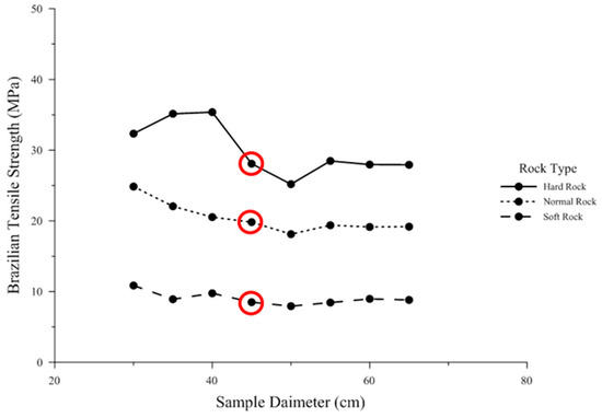 Figure 8. Brazilian tensile strength (BTS) test results (low modulus ratio), sample diameter at REV in red circle.