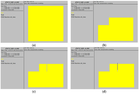 In order to simulate the rock splitting process in all types of rock using PFC2D, the rock splitting models of size 6 m × 6 m were prepared with fixed boundary conditions, as shown in Figure 11a. The particles at the model boundaries were fixed to control the displacements at the boundary. The microscopic parameters obtained for each rock type through REV calculations were used in simulating the rock splitting model for each case. In order to prepare a free surface, the particles at the top of the model as well as adjacent to the proposed borehole were removed up to 2 m, as shown in Figure 11b. Subsequently, a borehole of 76 mm diameter was excavated by removing the particles starting from the upper free surface of the model up to a depth of 1.4 m, as shown in Figure 11c. Finally, two walls were installed at both sides of the excavated borehole up to 1 m depth for simulating the counter-wedges, as shown in Figure 11d. The stiffness of both walls was kept as 200 GPa [31] in order to match the stiffness of structural steel used in fabricating the counter-wedges of the split-wedge system.