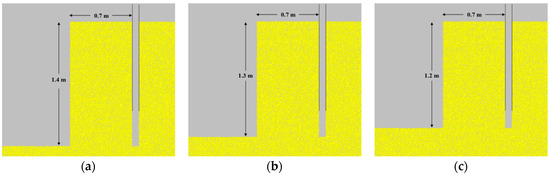 Figure 14. Rock splitting model using constant borehole spacing (0.7 m) with three different borehole depths, (a) borehole depth = 1.4 m; (b) borehole depth = 1.3 m; (c) borehole depth = 1.2 m.