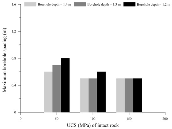 Figure 13. Comparison of maximum borehole spacing values at different intact rock strengths (borehole depth = 1.4 m).