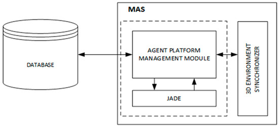 The general architecture of the system is made up of two large blocks: a MAS and a tool for designing and visualizing three-dimensional environments. On the one hand, the MAS is composed of a set of intelligent agents that allow to perform the simulation of the desired model. For the implementation of this component, the JADE platform [31] has been used, as it will be detailed later. The developed platform is oriented towards the modeling of the MAS as a VO of agents. From this perspective, it is able to define a structure, roles, and a set of rules that regulate the interactions between agents. To do this, a higher-level layer to JADE, responsible for managing the MAS, is included in the system. Through this, it has been possible to provide the system with a set of additional functionalities that maximize the capabilities of MOVICLOUD, allowing a better interactivity and configuration on the part of human experts. These functionalities are detailed below: