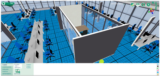 In addition, the environment in which the simulation will be carried out must be defined, in this case the building of the company under study. For this purpose, the 3D editing tool mentioned above was used. The 3D editing process begins from the plans of the building, so the environment in which the simulation takes place is as similar as possible to the real world. Furthermore, the disposition of the furniture inside the building must also be defined in order to evaluate, for each job, if each of the working places are accessible for people with different types of disabilities.