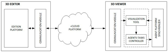 It has been necessary to add synchronization mechanisms between the 3D viewer and the agent platform, so that there is a correspondence between what happens on the agent platform and what is displayed in this tool. In addition, this platform is the main way of interaction between humans and machines, allowing experts in HR to modify the simulations based on their objectives. The operations that can be carried out are the creation and elimination of agents and assignment of tasks. As discussed in the previous chapter, all the operations requested from the 3D environment are communicated to the agent platform, which will attend these requests and confirm or not its completion in order to update the visualization status accordingly. Figure 4 shows the set of modules that make up the 3D editing environment and 3D viewer, previously explained.