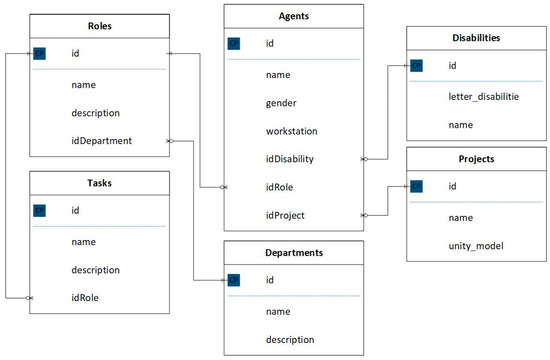 Next, the structure of the database that will be used to store the structure of the VO is shown in Figure 5. Through a relational model, it is possible to define the different roles associated with the agents, as well as the tasks that can be carried out by an agent with a specific role. Additionally, three specific tables have been incorporated for the case study in which the proposed model will be evaluated, thus being able to define which agents intervene in each project, if they present some type of disability and associate roles with the different departments of a company.
