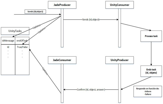 - JadeConsumer, opens a TCP socket to receive information regarding the performed tasks. In Unity, UnityProducer is in charge of sending the confirmation of the performed tasks.