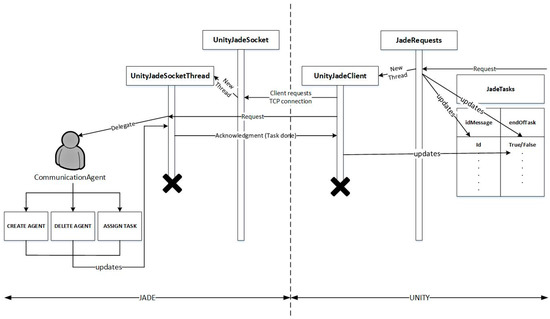 Regarding the tasks that are performed in Unity and later updated in JADE, UnityTasks resides on the Unity side, since it is in charge of making requests and must verify that everything that is done in JADE is updated later in Unity. Figure 8 shows the scheme that follows this communication, where a TCP socket will be used. JADE is the server which will listen to the requests performed from Unity. Each request in Unity is a new client that requests a connection to the server, so throughout the execution several clients can coexist. The requests made from Unity can be of three different types: creation of agents, elimination of agents or assignment of tasks to agents.